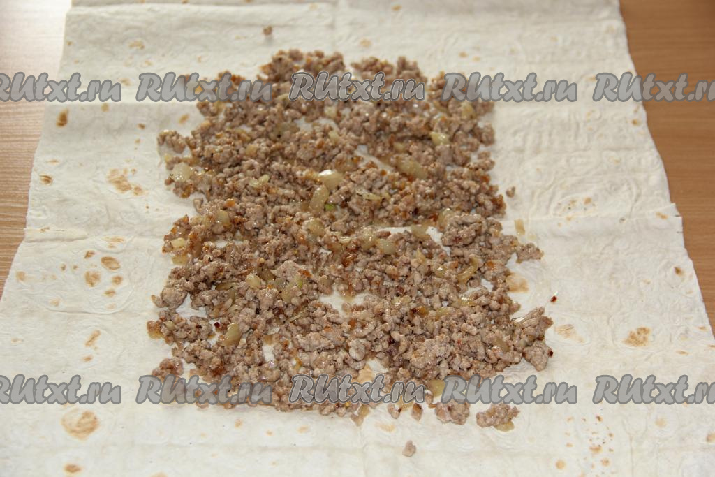 На лист лаваша выложить фарш и разровнять, оставляя края лаваша чистыми.