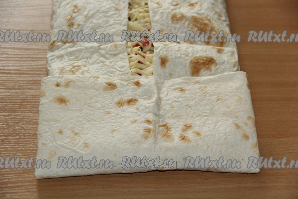 Края лаваша подвернуть с двух сторон, а затем завернуть начинку в лаваш в виде рулета. Ширина рулета из лаваша должна быть по размеру формы для запекания.
