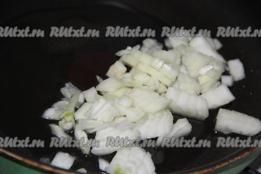 Лук очистить, удалить из болгарского перца семенную коробку. В сковороду влить немного растительного масла, выложить мелко нарезанный лук, обжарить его, иногда перемешивая, до золотистого цвета.