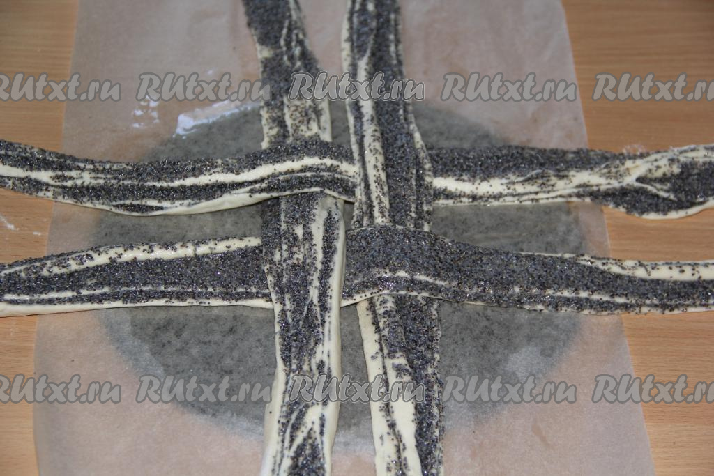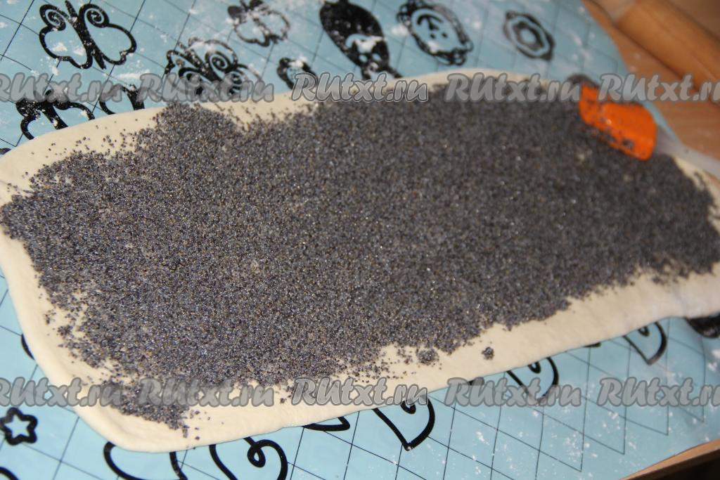 Выложить половину маковой начинки и равномерно распределить её по тесту, оставляя края пласта чистыми.
