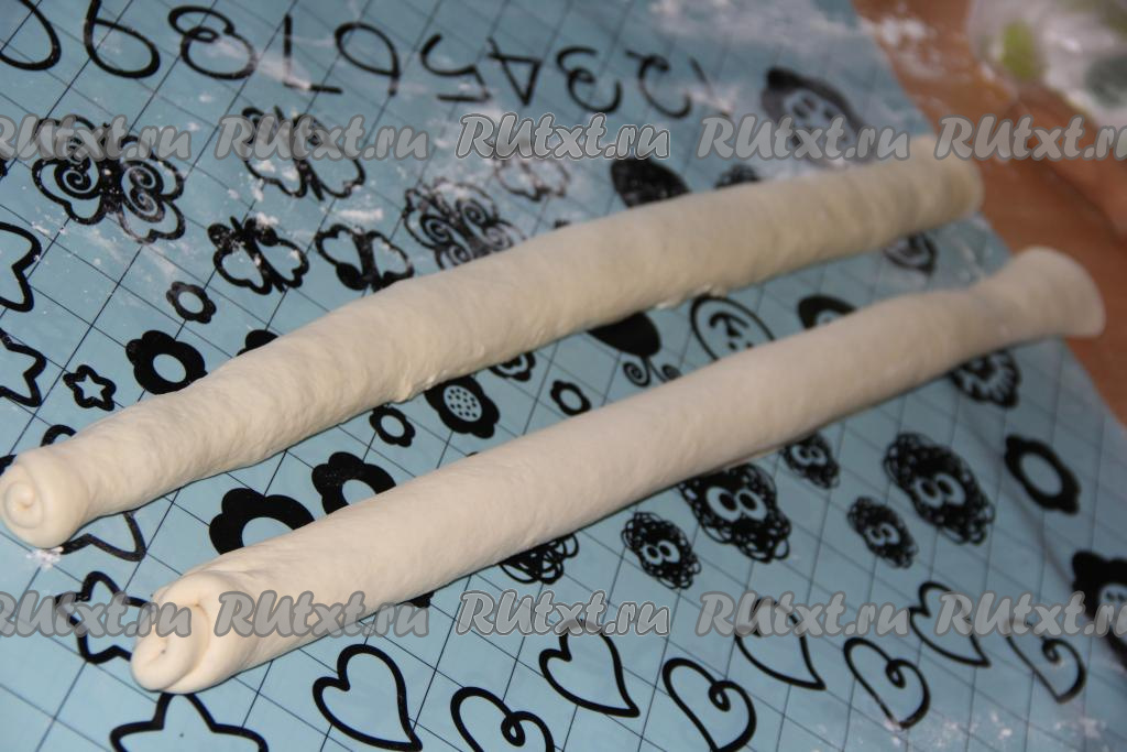 Пергамент смазать растительным маслом. Выложить 4 полоски теста разрезом вверх (как на фото).