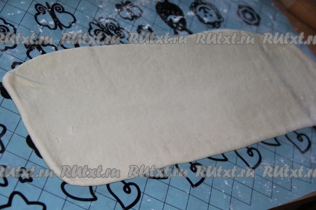На припылённом мукой столе раскатать одну часть теста в прямоугольный пласт.