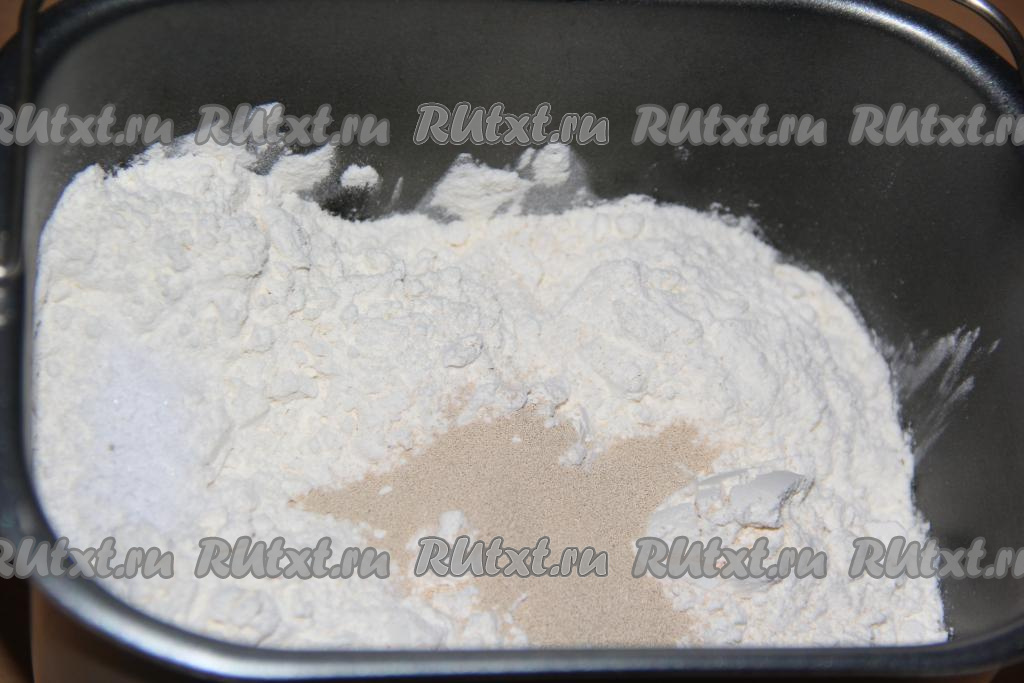Всыпать муку, дрожжи и соль. Выставить на 1,5 часа режим "Замес теста".