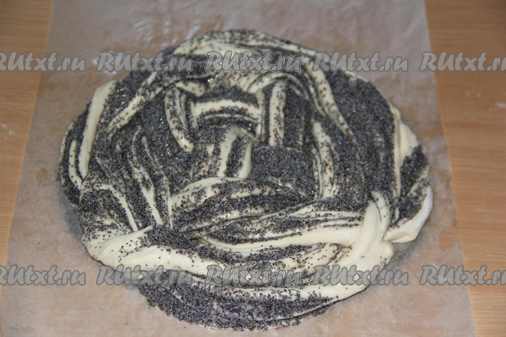 Свернуть тесто с начинкой в длинный рулет. Аналогично сформировать второй рулет. Таким образом у нас получится 2 рулета с маком.