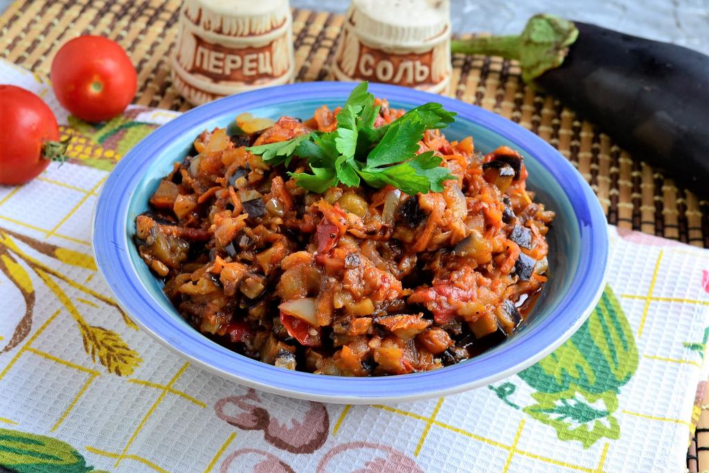 Дать баклажанной икре, жареной на сковороде, остыть, затем поместить в холодильник хотя бы на 1 час и можно подавать к столу. Приготовьте блюдо по этому рецепту и насладитесь его насыщенным вкусом!