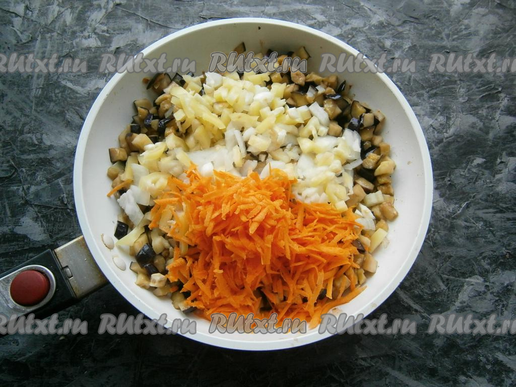 В сковороде разогреть растительное масло, обжарить в нём хорошо отжатые баклажаны в течение 4-5 минут на достаточно сильном огне, периодически перемешивая. Добавить лук с болгарским перцем и натёртую на крупной тёрке морковь.