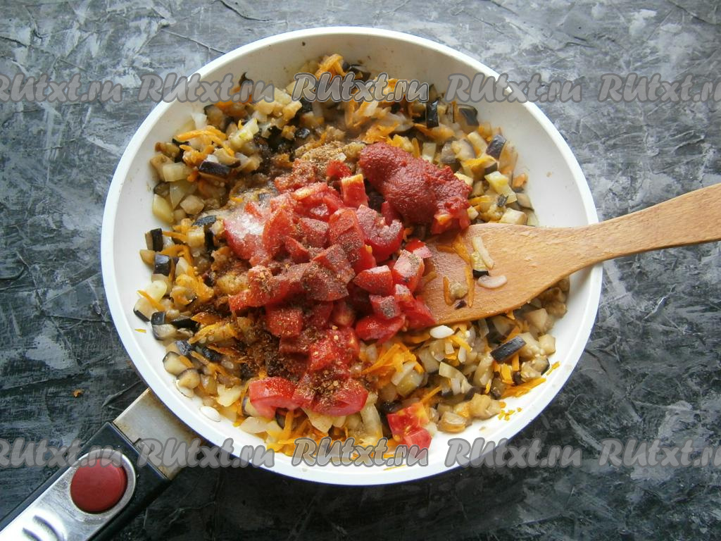 Перемешать овощи на сковороде и обжаривать на среднем огне 3-4 минуты, иногда помешивая, после чего добавить свежие помидоры, нарезанные небольшими кубиками, а также томатную пасту, соль, смесь перцев, сахар и кориандр, влить 50 мл тёплой воды.