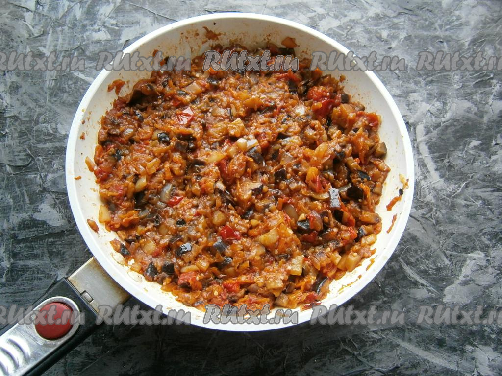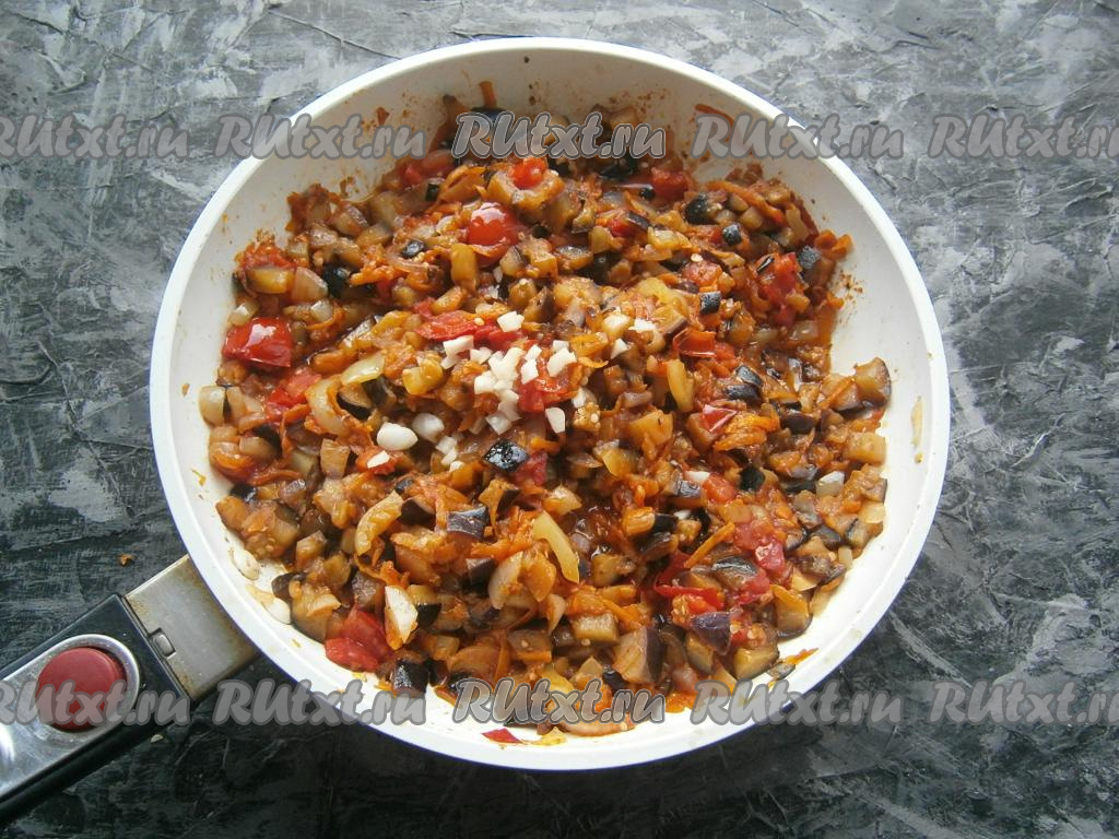 Хорошо перемешать и готовить баклажанную икру на сковороде на небольшом огне около 15 минут, периодически перемешивая. Минут за 5 до готовности добавить измельчённый чеснок.