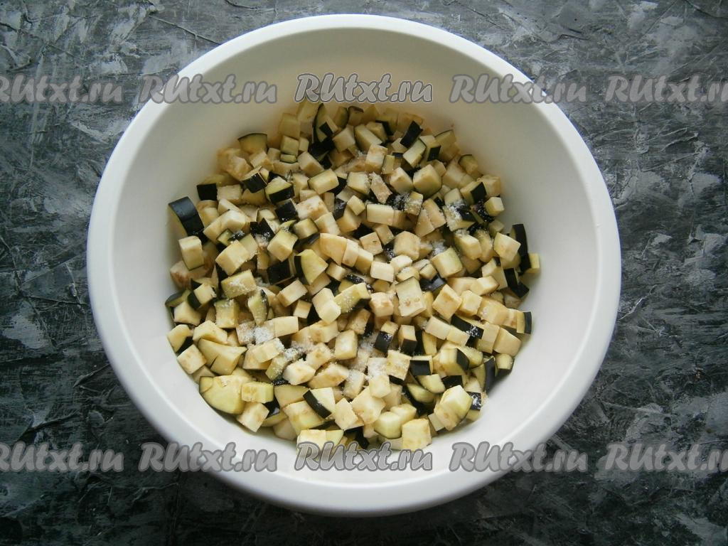 Лук, морковь и чеснок очистить. Удалить из болгарского перца семена и плодоножку. Вымыть баклажаны, нарезать маленькими кубиками, посолить, оставить на 20-30 минут, затем хорошо отжать.