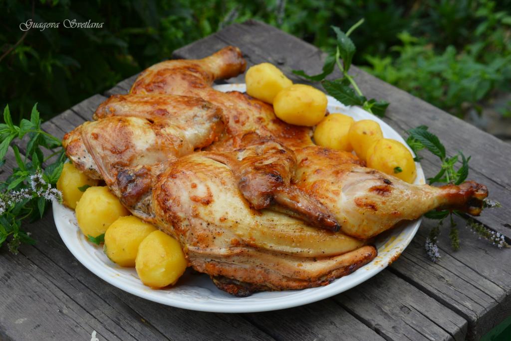 Когда курочка запечётся до румяной корочки, достаём её из духовки и снова переворачиваем на грудку.