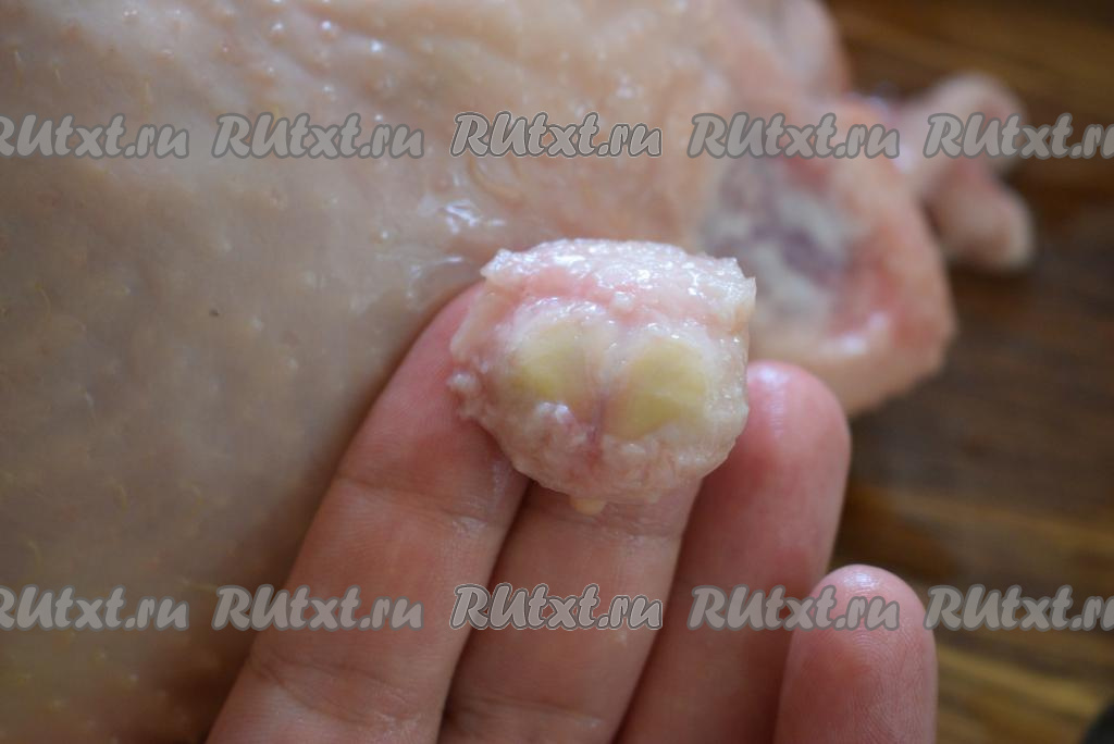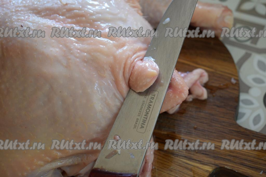 Удалим, по желанию, закрылки и железу, находящуюся на гузке птицы, которая, если от неё не избавиться, даёт неприятный запах при запекании.
