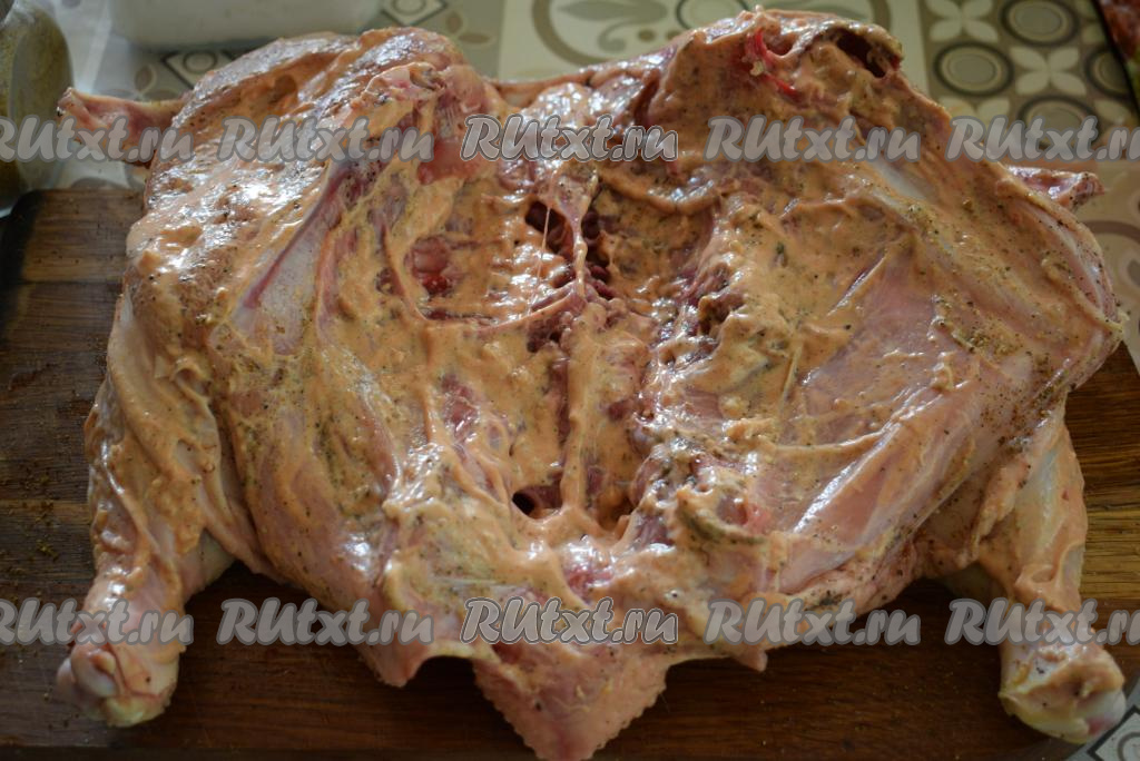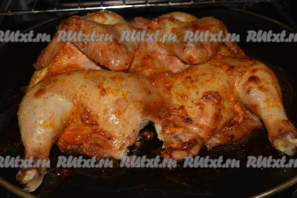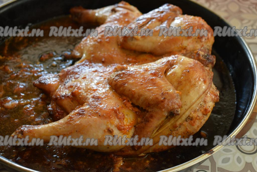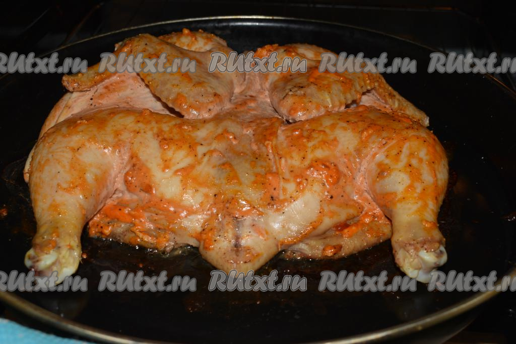 Даём курице пропитаться и промариноваться в течение 1,5-2 часов. Далее выкладываем птицу спинкой вверх на противень, смазанный растительным маслом, и отправляем запекаться в разогретую духовку при температуре 180-190 градусов на 50 минут.