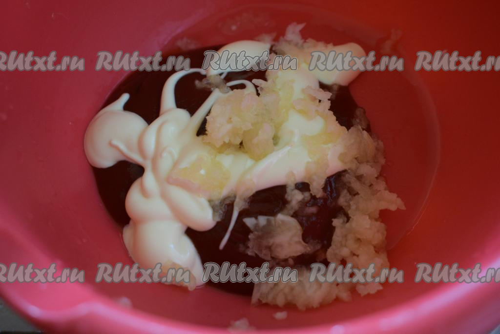 В это время готовим маринад, для этого в миску кладём кетчуп, майонез (или сметану), добавляем пропущенный через пресс чеснок, солим и перемешиваем до однородности.