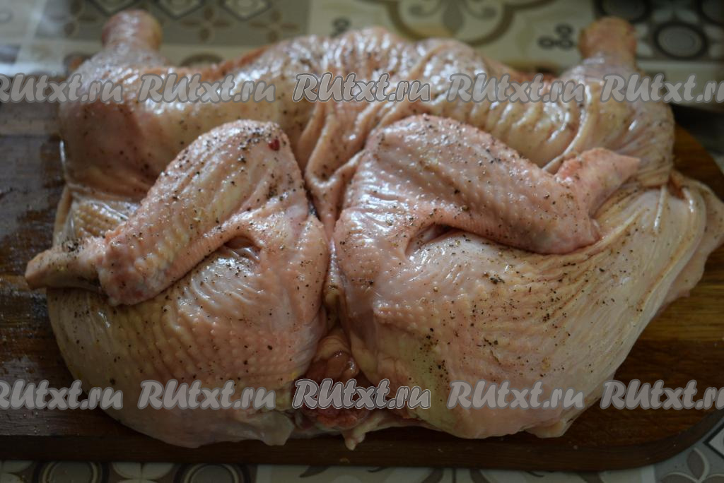 Натираем курицу специями, солью и свежесмолотым перцем, оставляем пропитаться минут на 10.