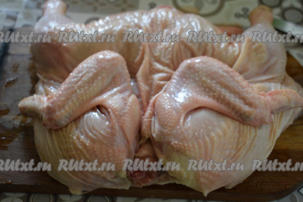 Разрезаем курицу по грудке пополам и распластываем птицу.