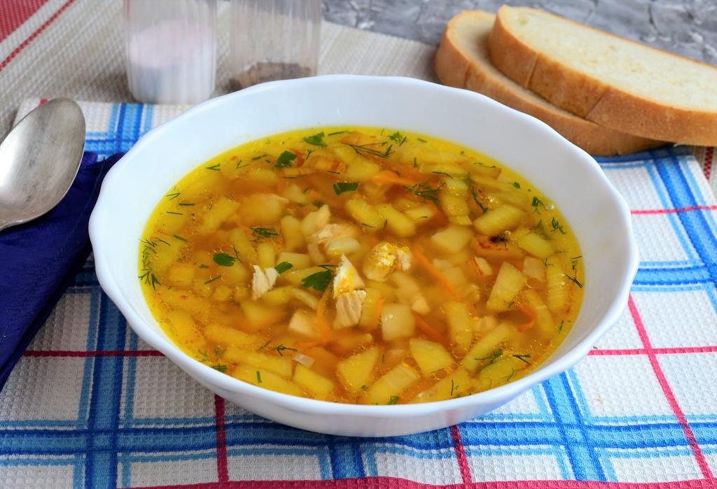 Морковь, картошку и лук очистить. В кипящий бульон выложить нарезанный небольшими кусочками картофель и варить на небольшом огне 20-25 минут с момента закипания, после чего выложить в кастрюлю нарезанное куриное мясо.