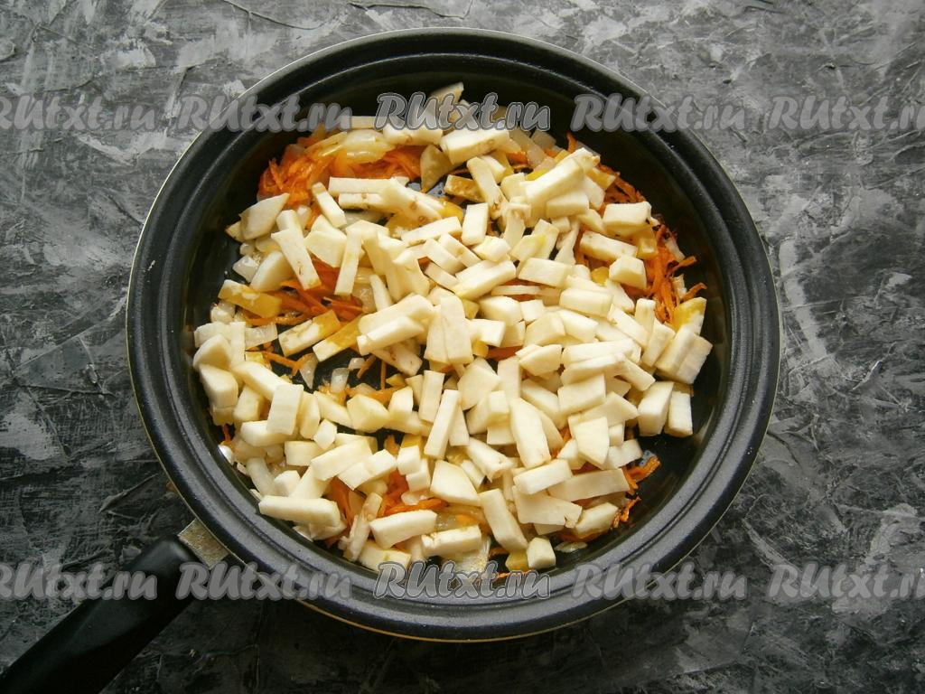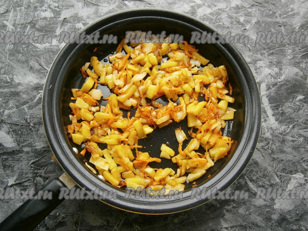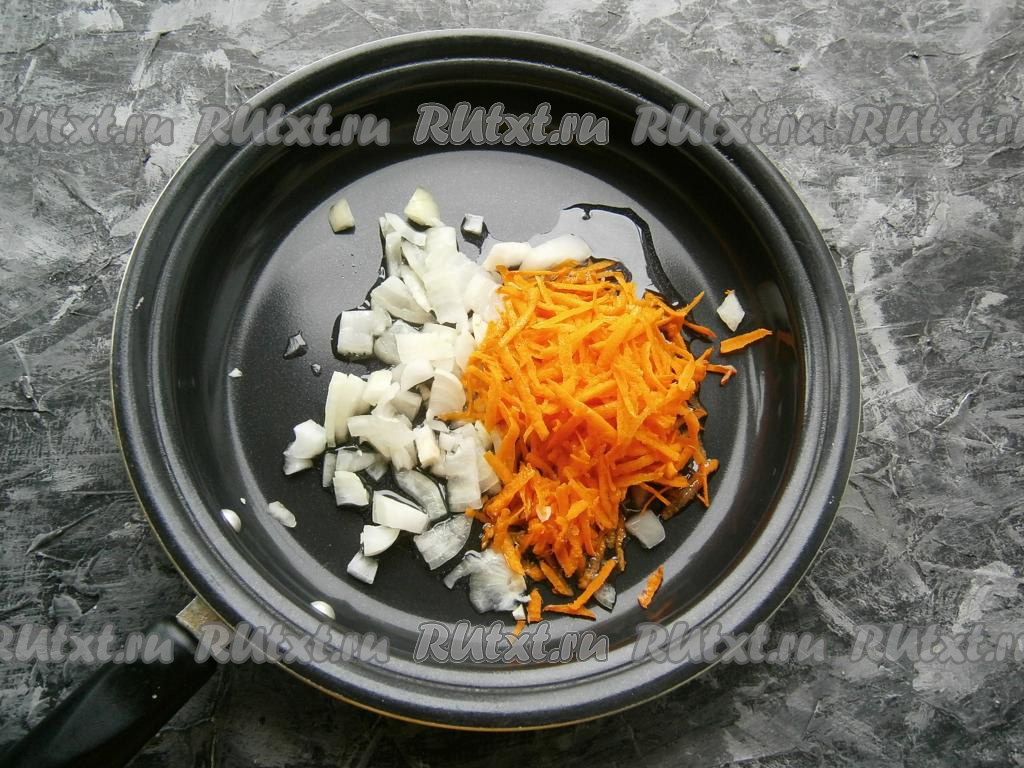 Лук нарезать небольшими кусочками, морковь натереть на крупной терке, а затем выложить овощи в сковороду с растительным маслом.