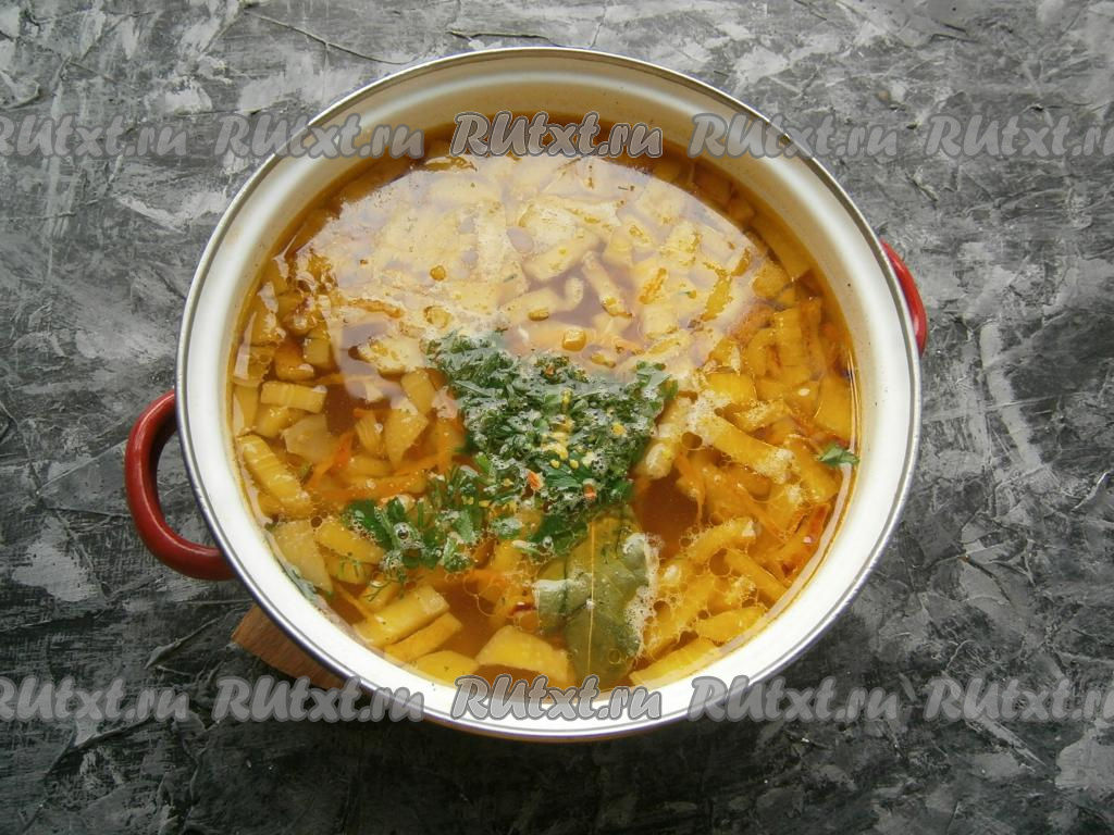 Когда картофель станет достаточно мягким, в куриный суп выложить обжаренные баклажаны с луком и морковью, специи, лавровый лист и измельчённую зелень укропа и петрушки. После закипания уменьшить огонь и варить суп 5-7 минут.