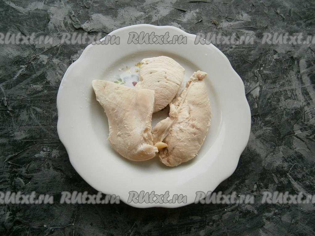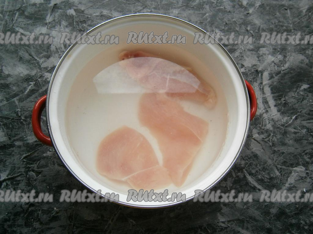 Куриное мясо поместить в кастрюлю, залить 1-1,2 литрами воды, поставить на огонь. После закипания уменьшить огонь, пену убрать, воду посолить и варить мясо минут 20-25.