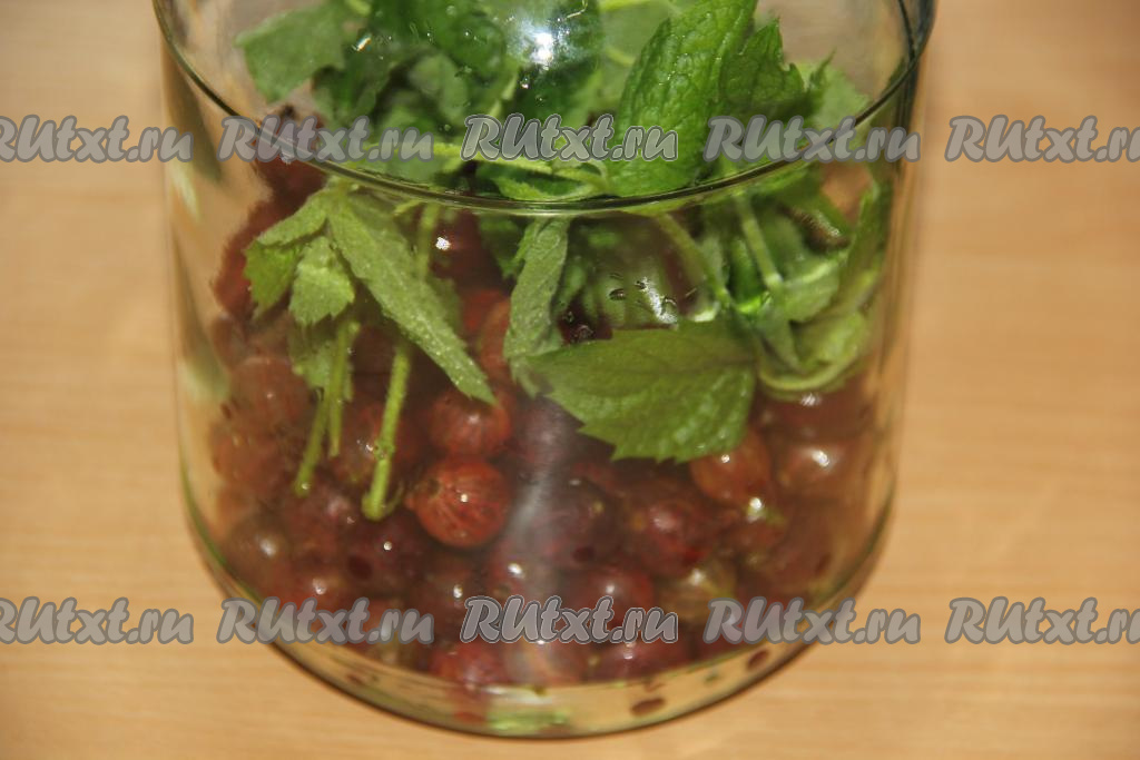 Промыть листики мяты под проточной водой. Добавить мяту в банку к крыжовнику.
