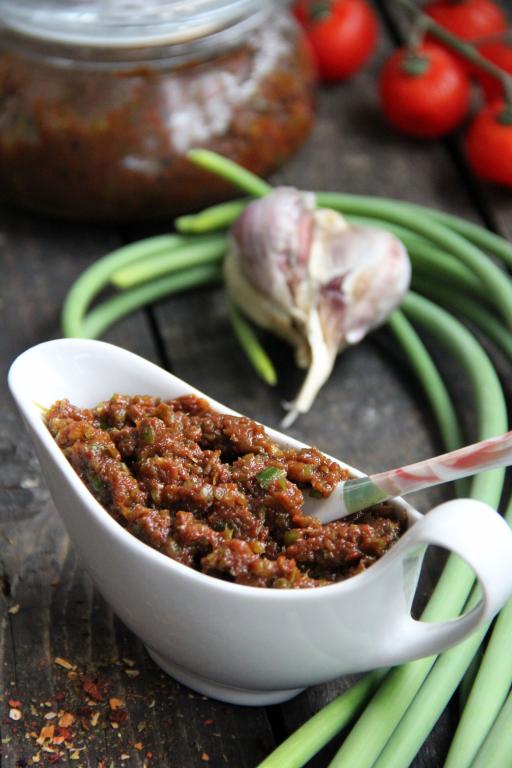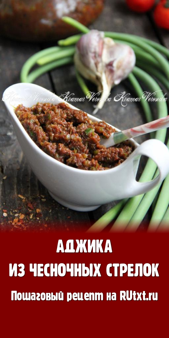 Хочу поделиться простым рецептом приготовления аджики из чесночных стрелок с томатной пастой. Подать такую аджику можно на кусочках хлеба к супу или к мясу. Очень вкусно с шашлыком. Чесночная аджика получается ароматной и не очень острой. Ещё такую аджику можно использовать для приготовления маринадов к мясу и рыбе. Хранить её следует в холодильнике, желательно в стеклянной таре с закрытой крышкой.