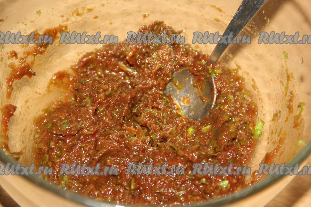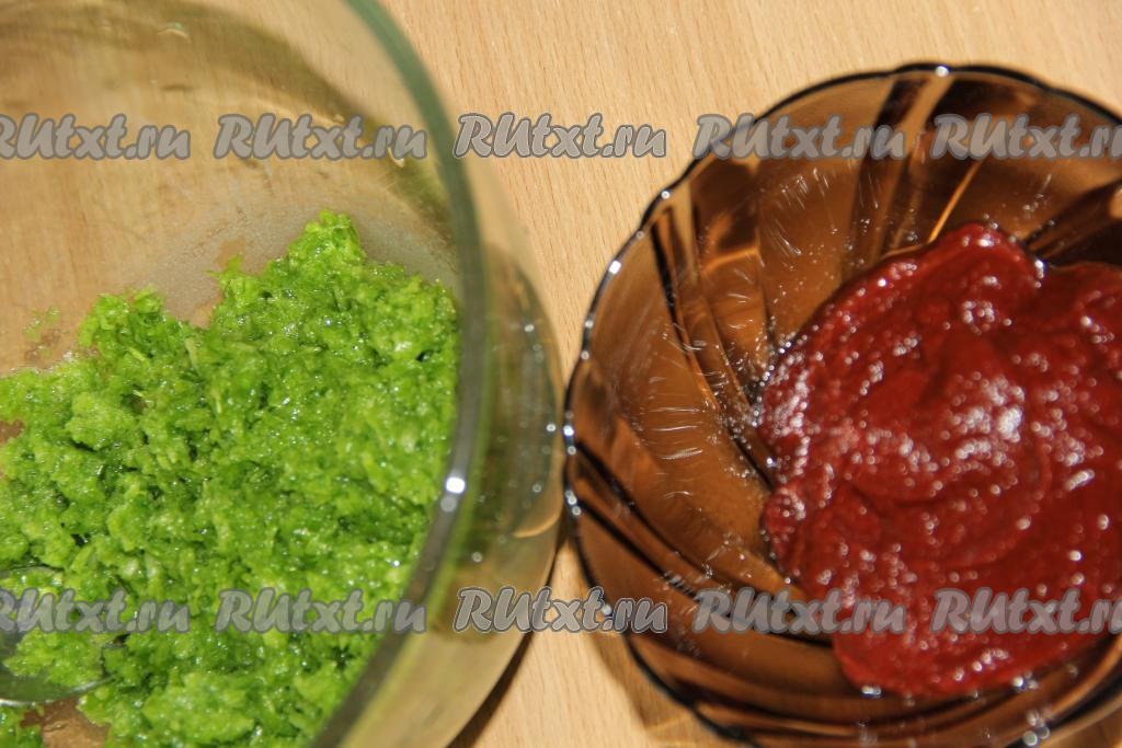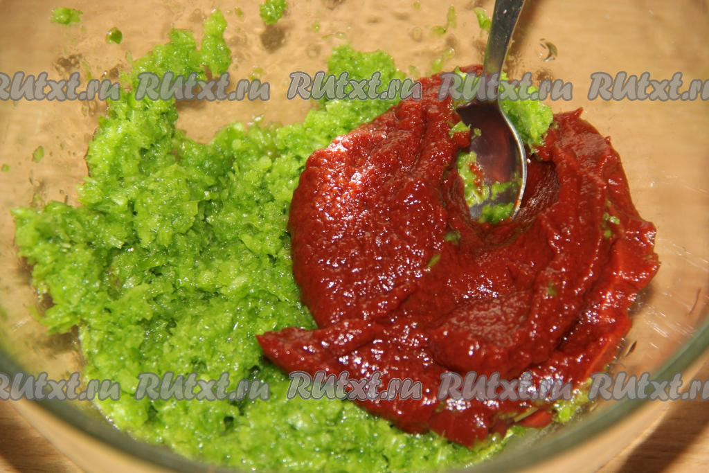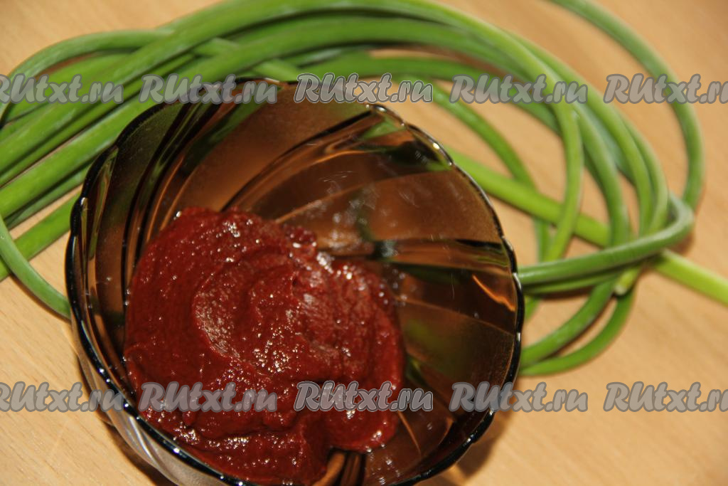 Соединить измельчённые чесночные стрелки и томатную пасту, тщательно перемешать.