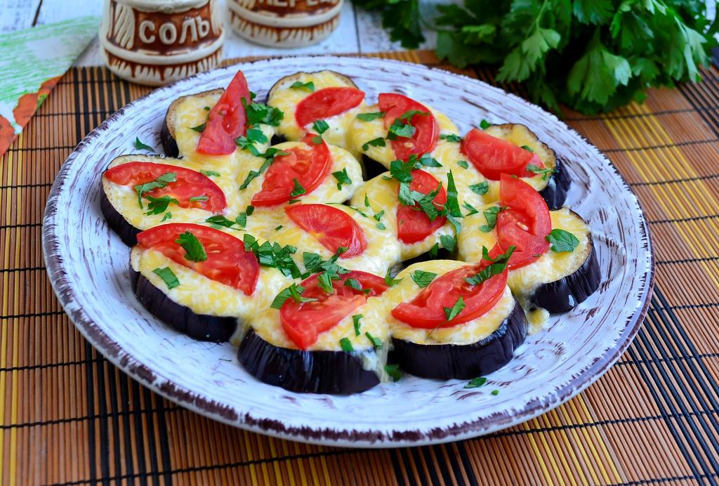 Чтобы закуска стала ярче, сверху украсить баклажаны дольками свежего помидора и посыпать измельченной зеленью.