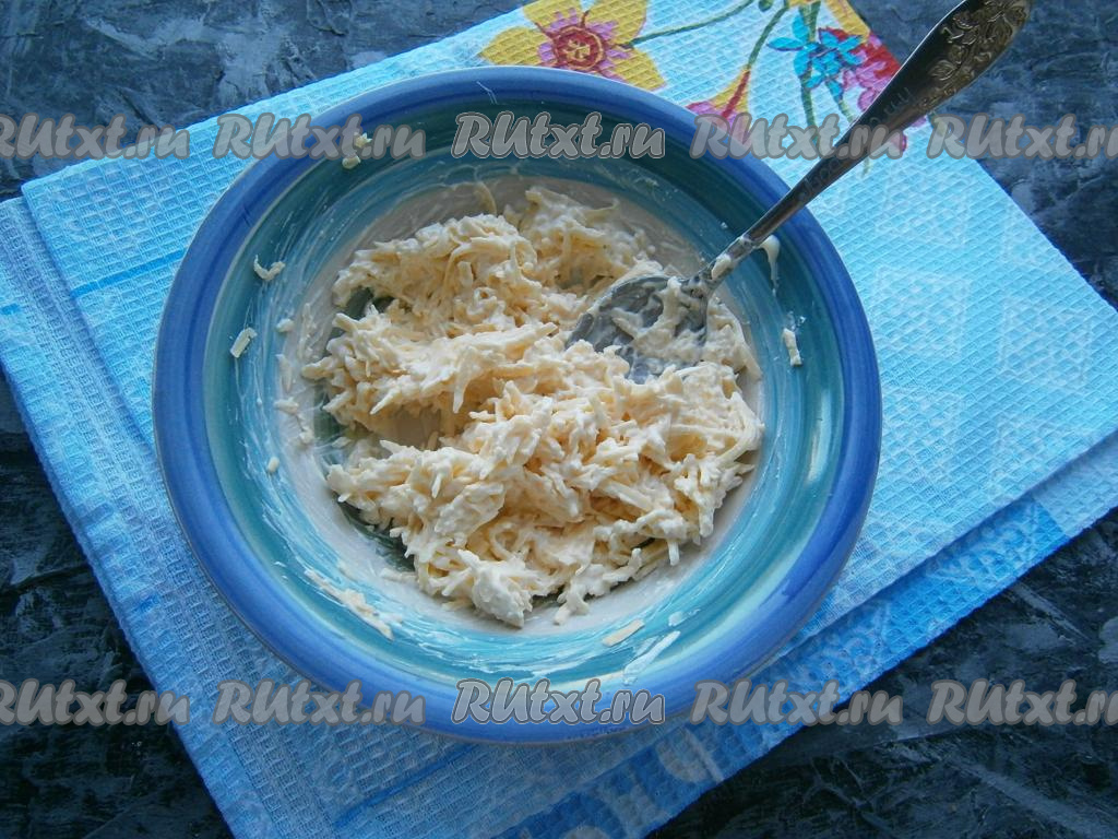Сыр натереть на средней (или мелкой тёрке), добавить пропущенный через пресс чеснок, а также майонез и сметану.