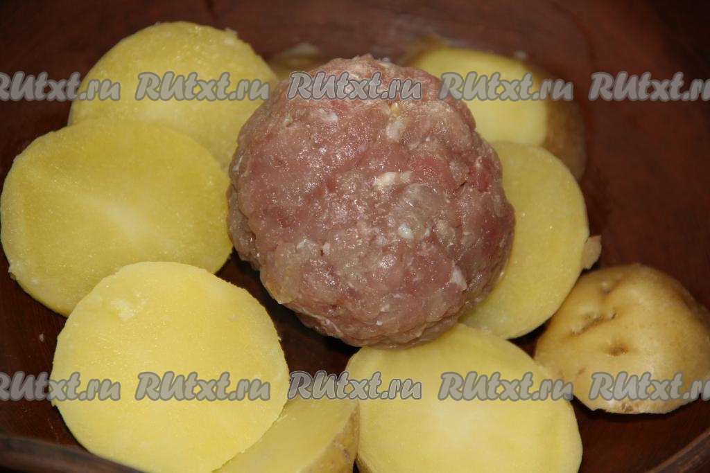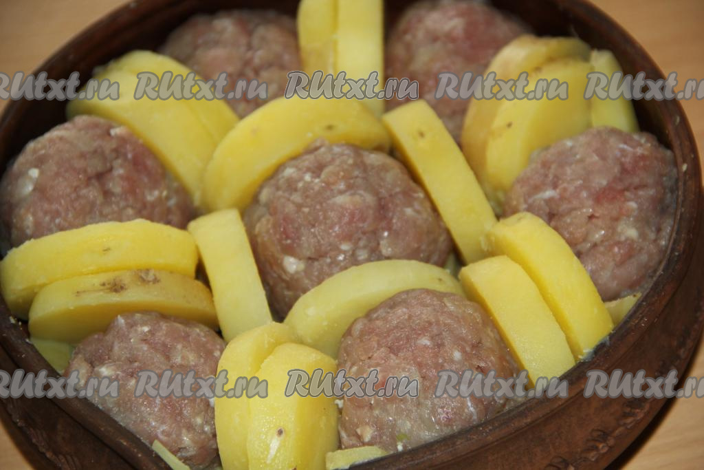 На дно круглой жаропрочной формы выложить кружочки картошки в один слой. Затем на слой картошки выложить фрикадельки, перекладывая их дольками картошки (как на фото).