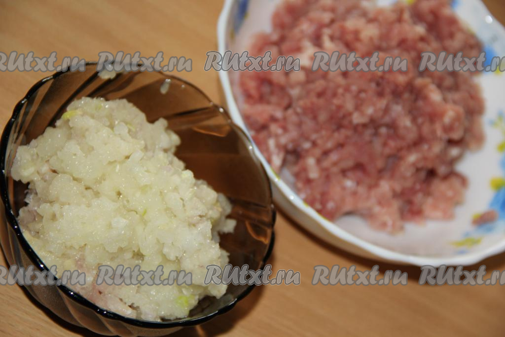Лук и чеснок очистить и пропустить через мясорубку. Соединить фарш, мякоть лука и чеснока, добавить соль и специи по вкусу, хорошо вымесить фарш.
