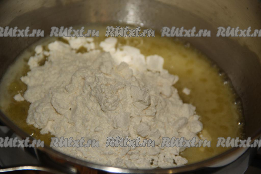 Для приготовления соуса в сотейнике растопить сливочное масло и добавить муку.