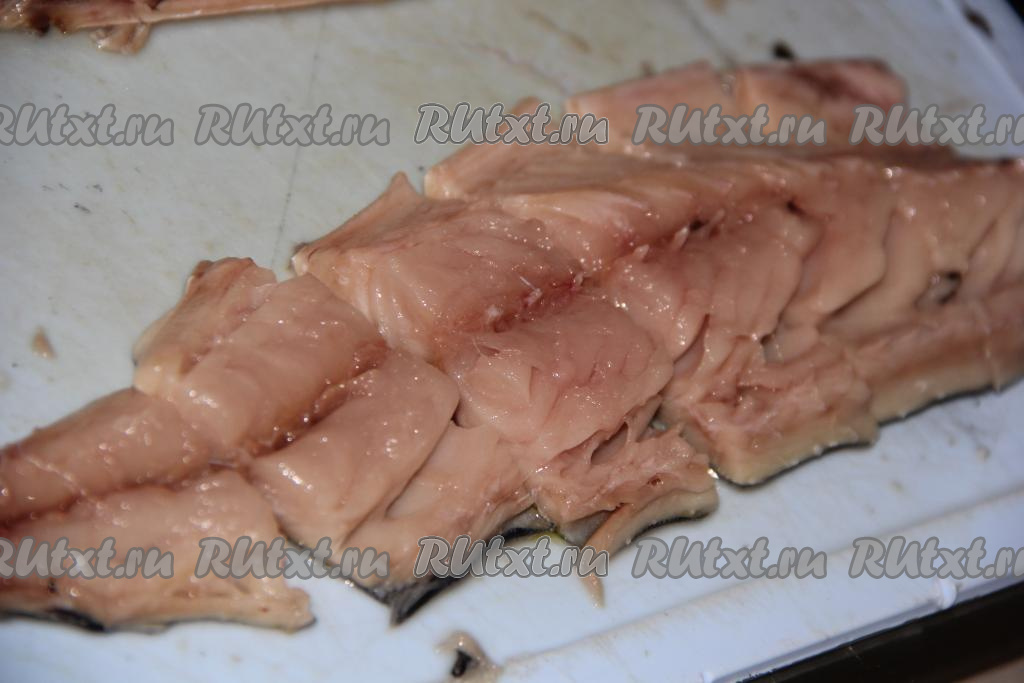 Рыбку предварительно разморозить при комнатной температуре. Отрезать голову, хвост, выпотрошить внутренности. Разрезать рыбу в длину и удалить косточки. Готовое филе нарезать на кусочки шириной, примерно, 1,5-2 см.