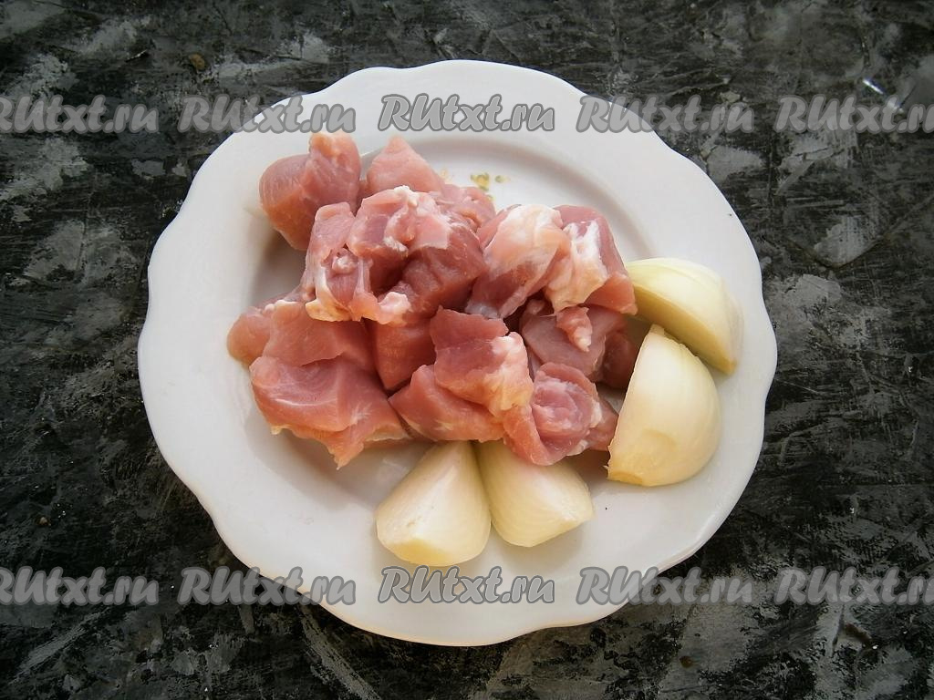 Нарезать мясо кусочками, добавить очищенный и разрезанный на 4 части репчатый лук.