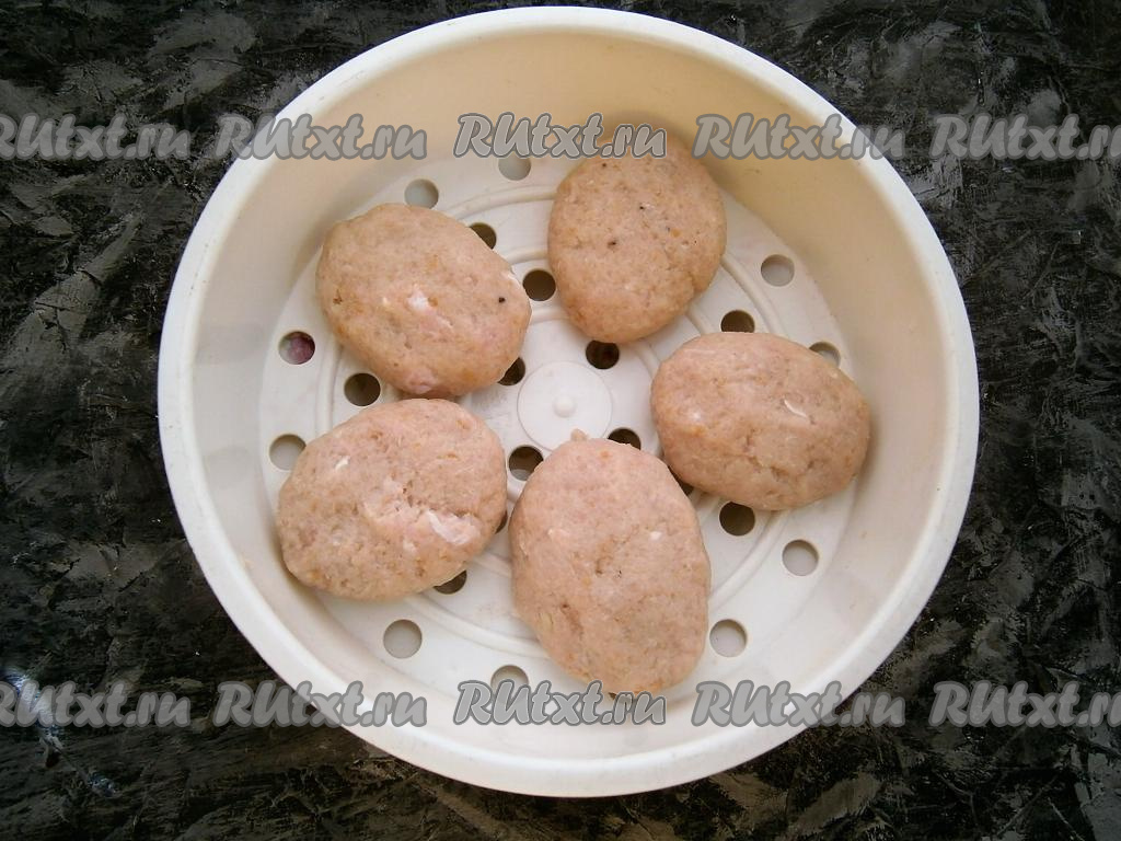 В большую чашу мультиварки налить воду на 1/3 объёма, сверху разместить чашу для варки на пару. В чашу для варки на пару выложить сформированные небольшие свиные котлеты.