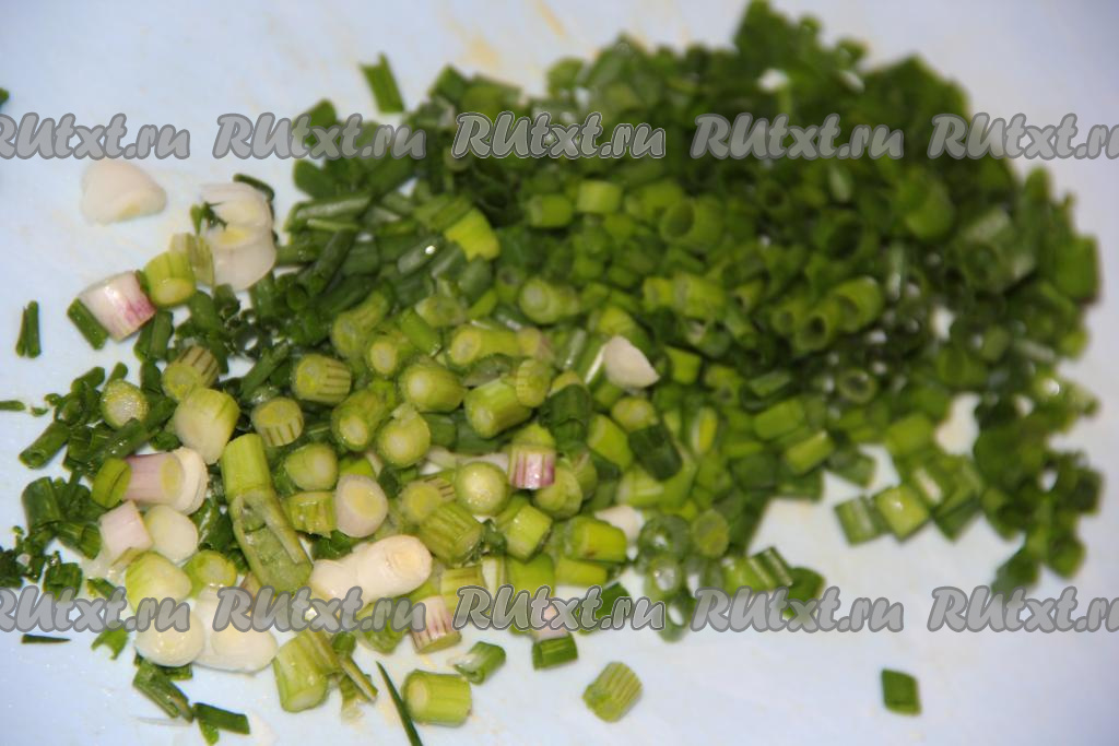 Для приготовления начинки зелёный лук промыть под водой и мелко нарезать.
