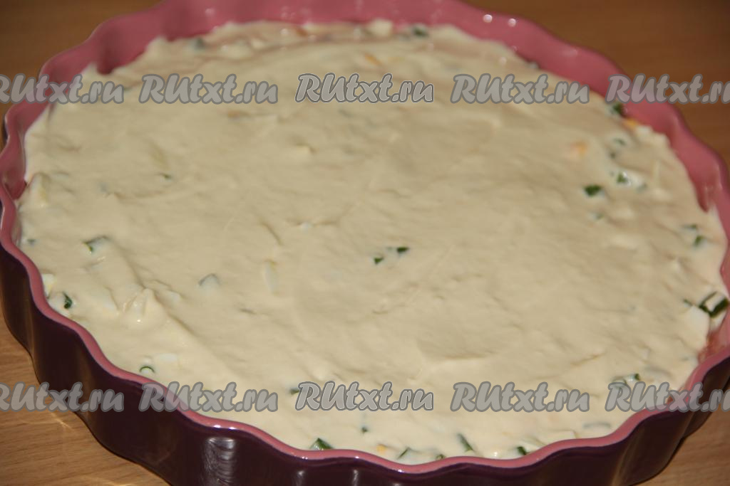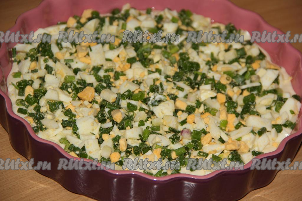 Затем выложить зелёный лук, смешанный с варёными яйцами, разровнять.