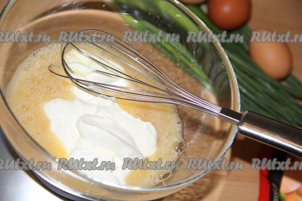 К взбитым яйцам добавить сметану и хорошо перемешать венчиком.