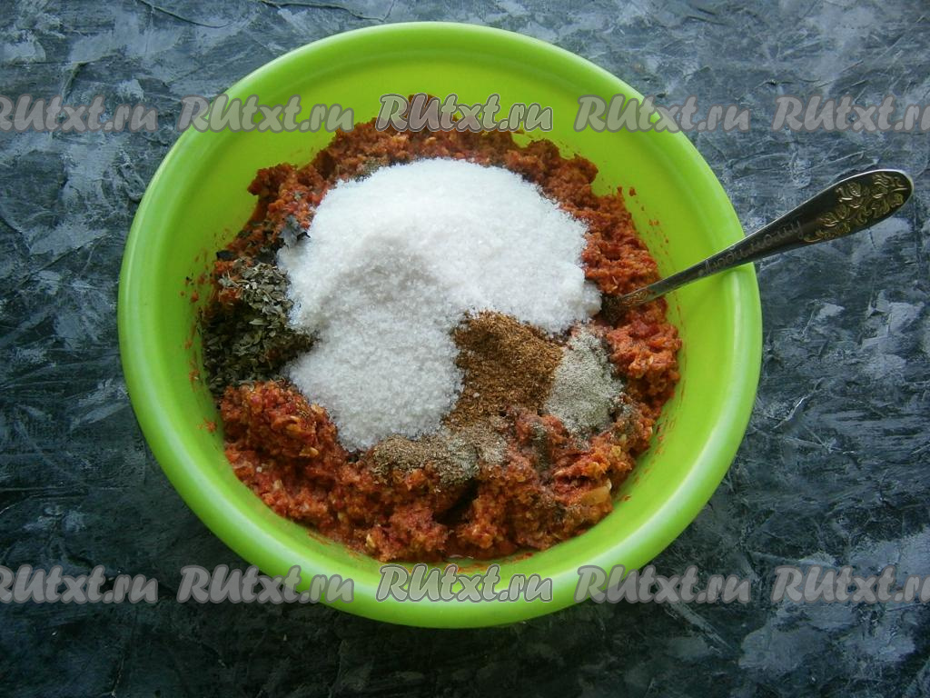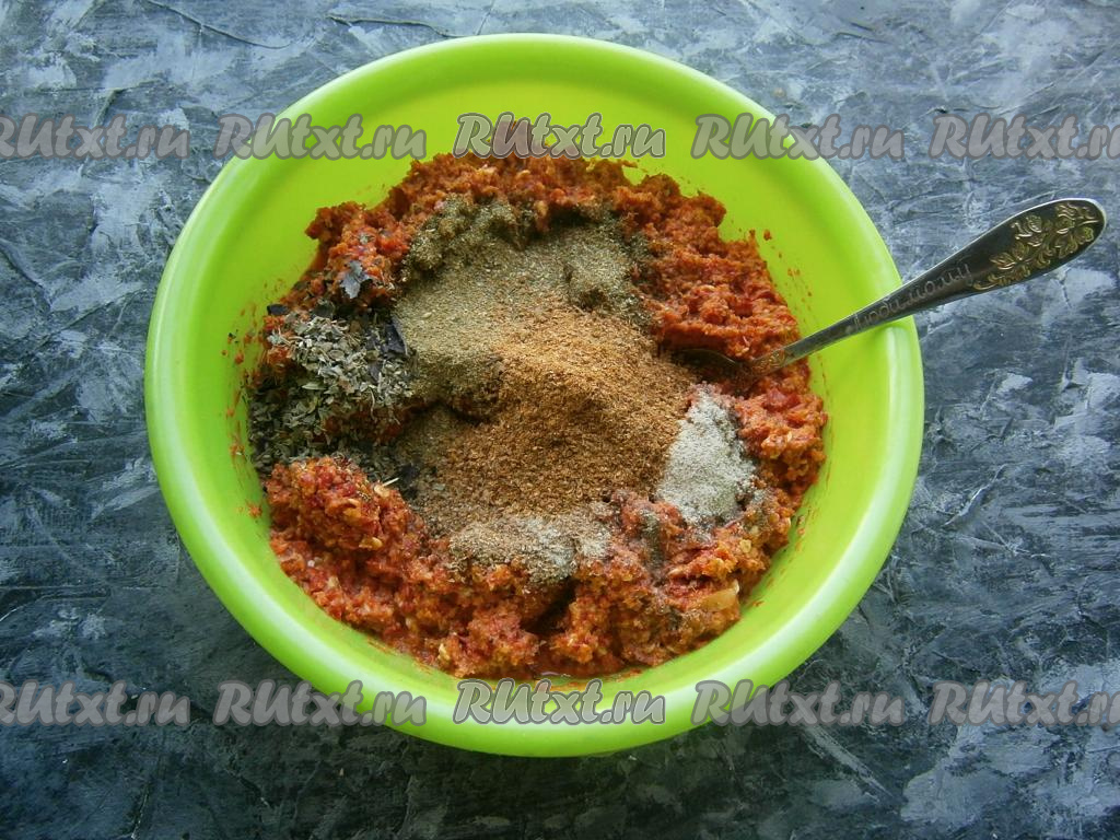 Добавить хмели-сунели, уцхо-сунели, базилик, кориандр, сухую аджику.