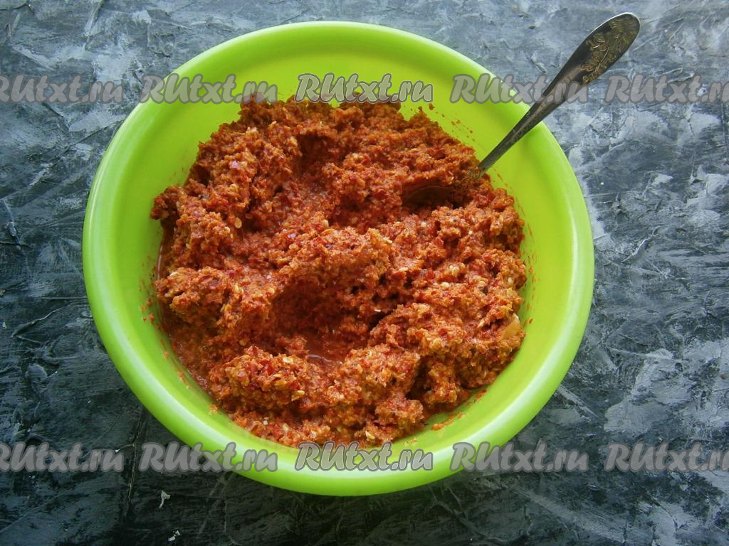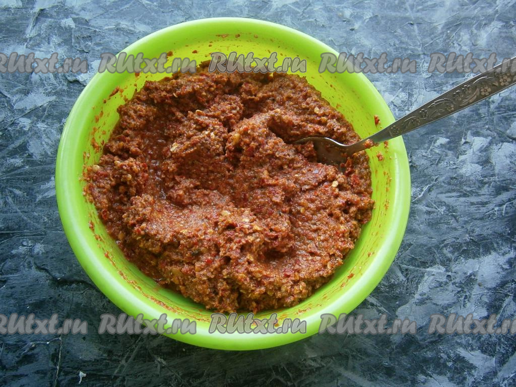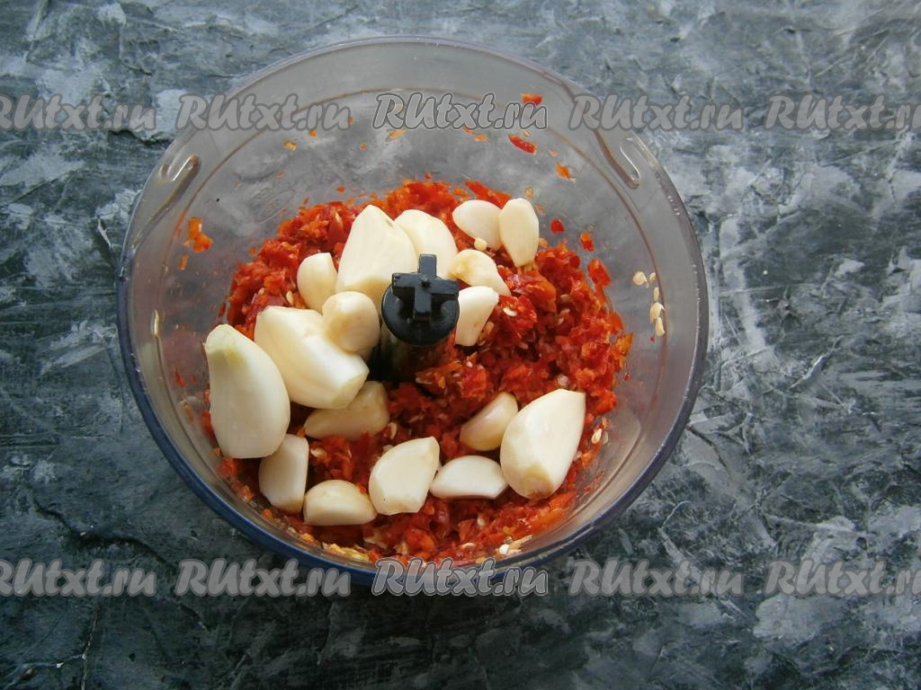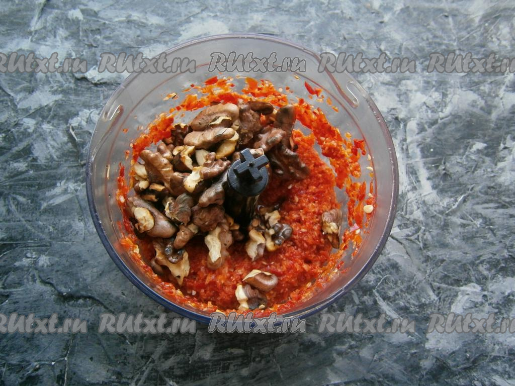 Измельчить перец с чесноком блендером, добавить грецкие орехи.