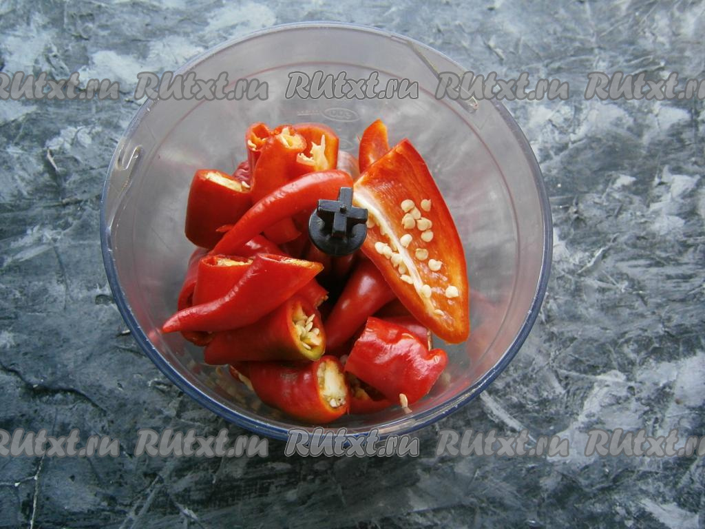 У перцев отрезать хвостики. Нарезать острые перцы на 2-3 части и поместить в чашу блендера. Семена можете удалить или, по желанию, оставить их.
