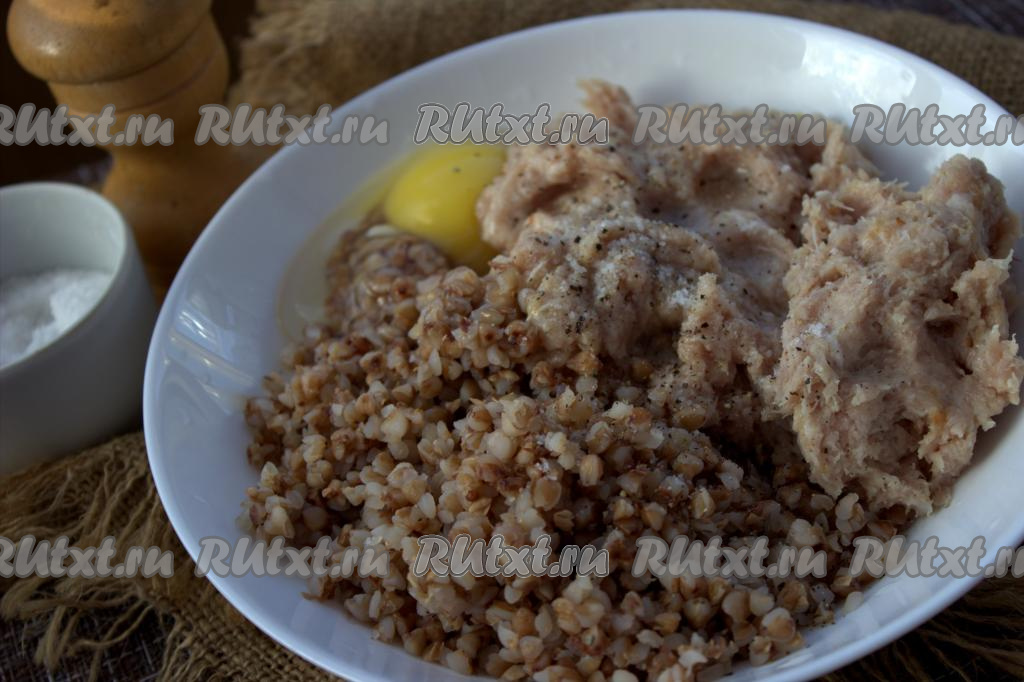 Соединить в глубокой миске мясной фарш, яйцо и остывшую гречневую кашу, добавить соль и специи по вкусу.