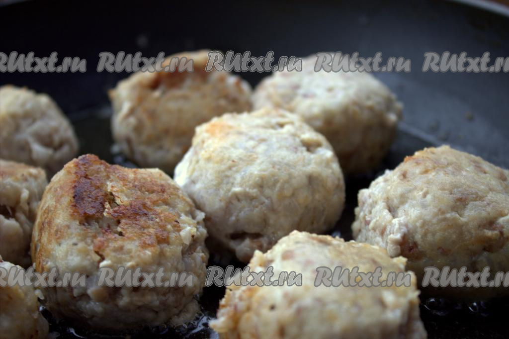 Из получившегося фарша сформировать шарики средних размеров - тефтельки. Растительное масло разогреть на сковороде, затем выложить сформированные тефтели и обжарить на среднем огне до румяности с двух сторон.