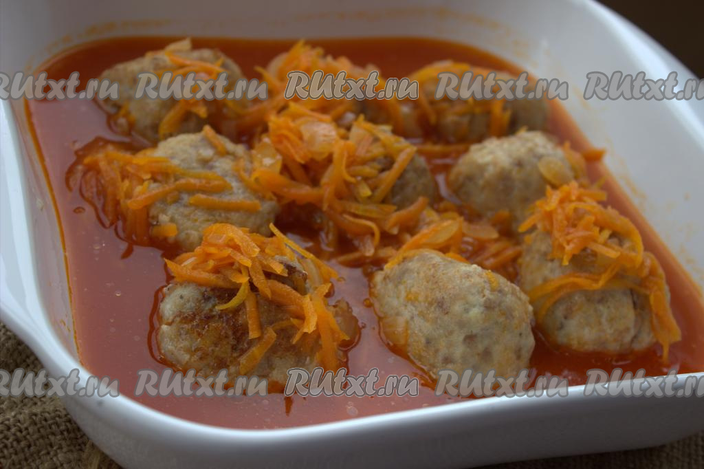 В жаропрочную форму выложить обжаренные тефтельки и аккуратно залить их томатным соусом. Форму накрыть фольгой (или крышкой, если она у Вас есть), поставить в разогретую духовку и готовить 20-25 минут при температуре 180 градусов.