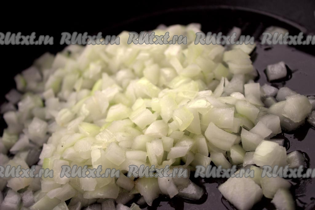 Лук и морковь очистить. Нарезать лук небольшими кубиками, выложить в сковороду с растительным маслом и обжарить на среднем огне до мягкости (в течение 3-5 минут), помешивая.