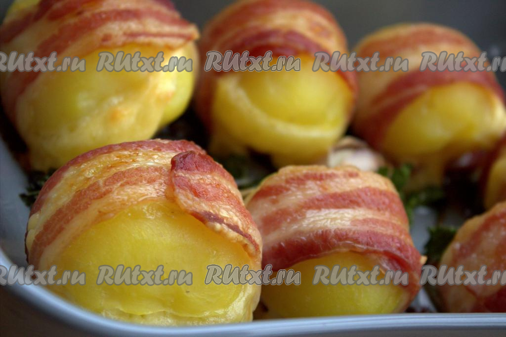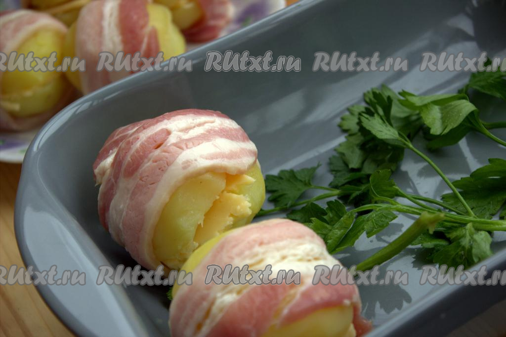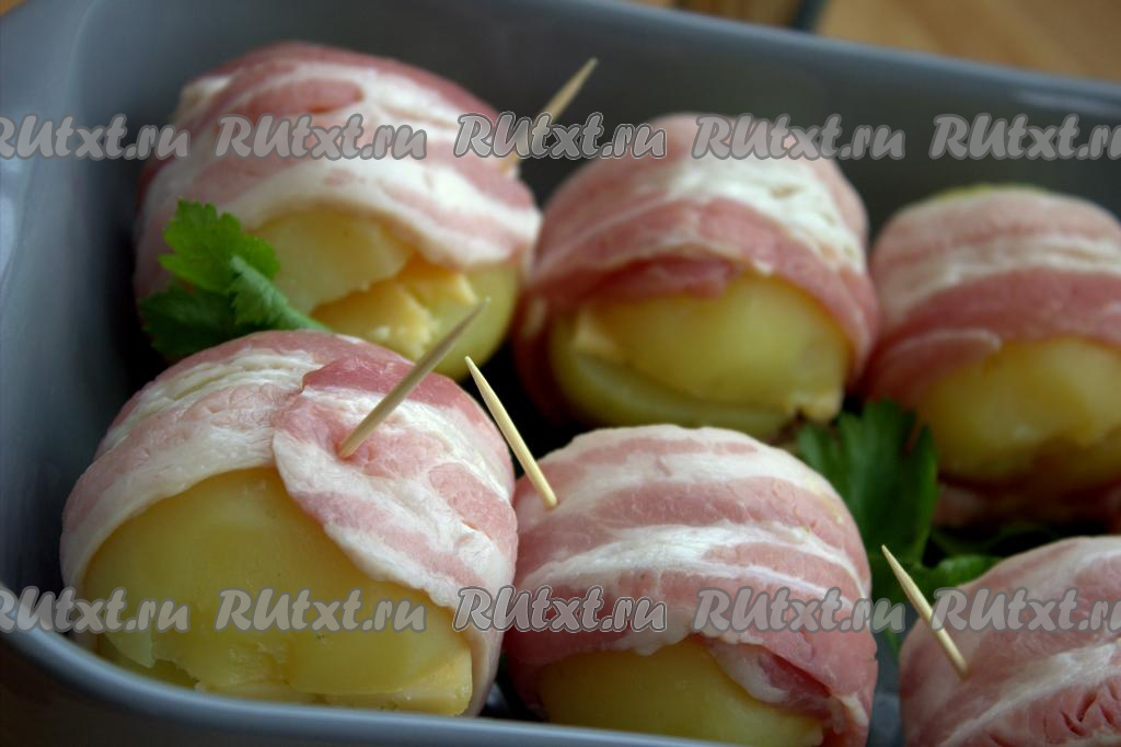 Запекать в заранее разогретой духовке при температуре 200 градусов 15-20 минут. На беконе должна образоваться аппетитная золотая корочка. С готового картофеля снять зубочистки.