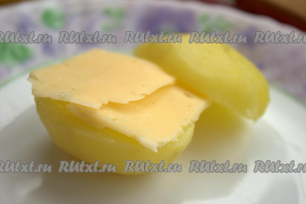 Разрезать каждую картофелину вдоль на две части. Поверх одной половинки картошки положить ломтик сыра, накрыть второй половинкой картошины, слегка посолить и приправить специями по вкусу.