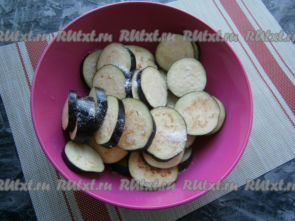 Нарезать баклажаны кружочками толщиной около 0,4-0,5 см, посыпать солью, перемешать и оставить на 15-20 минут.