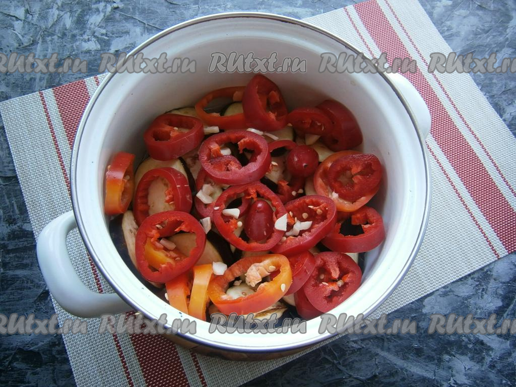 Накрыть кастрюлю крышкой, довести до кипения и варить баклажаны с перцем на небольшом огне около 20 минут, периодически перемешивая.