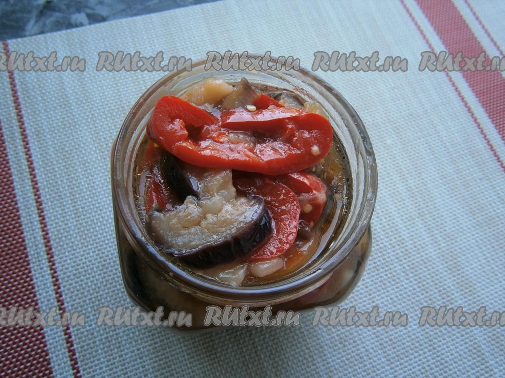 По окончании варки сразу плотно выложить баклажаны с перцем в простерилизованную банку, залить маринадом.