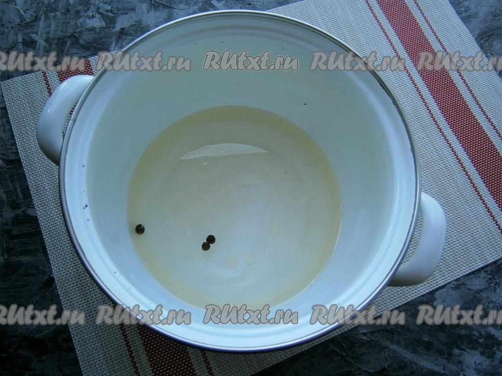 Для приготовления маринада в кастрюлю влить воду, растительное масло и уксус, добавить соль, сахар, горошины чёрного перца, поставить на огонь.